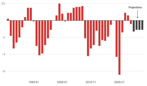 The government budget has moved back into deficit this financial year, after two years in surplus. But the current position, and projections over the next decade, are for relatively small deficits by historical standards.
