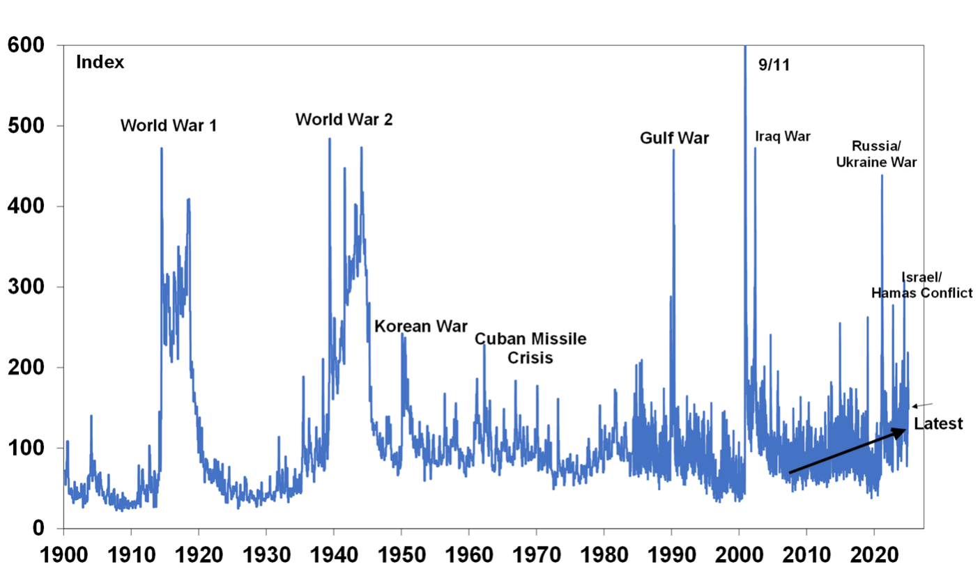 Reflects a tally of news articles covering geopolitical tensions. Source: matteoiacoviello.com, AMP