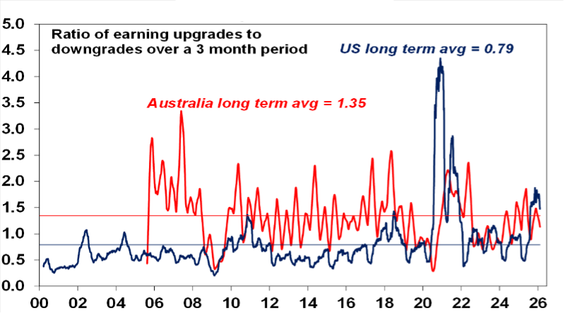 Consensus 12-month ahead earnings growth expectations are around 15% in the US and around 10% in Australia, with upwards revisions lately.