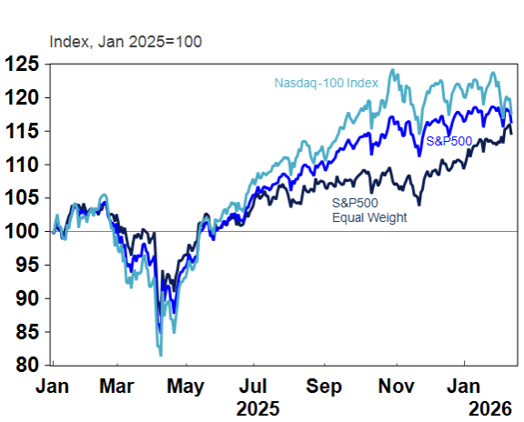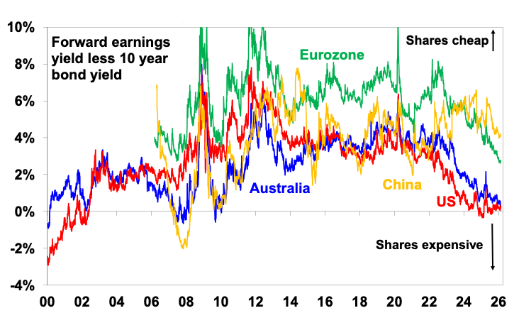 While concerns about the disruptive impact of AI, related capex and tech valuations have weighed on tech stocks this year leaving Nasdaq down 3% and the Magnificent Seven down 7.2%, an investor rotation into non-tech shares has pushed the equal weighted S&P 500 up 5.8% and limited the fall in the market cap weighted S&P 500 to 0.1%. The rotation has also seen other global share markets rise. A continuing rotation should mean that overall shares can still see gains this year, unless tech falls so much it drags the whole market down (as ultimately occurred in the tech wreck).